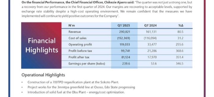 On the financial Performance, the Chief Financial Officer, Chikezie Ajaero said: “The quarter was not just a strong one, but a recovery from our performance in the first quarter of 2024. Our margins are recovering to acceptable levels, supported by exchange rate stability despite a high-cost operating environment. We remain confident that the measures we have implemented will continue to yield positive outcomes for the Company”.