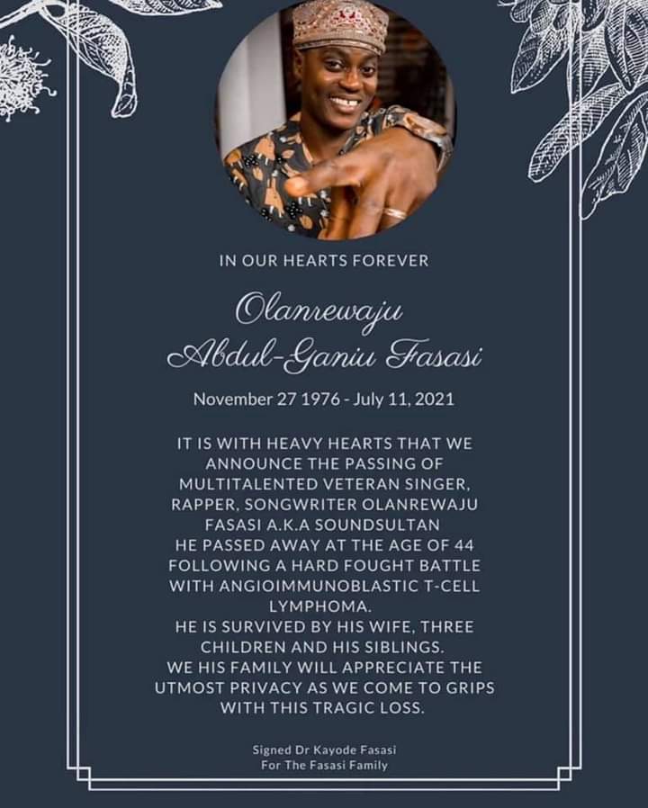 IT IS WITH HEAVY HEARTS THAT WE ANNOUNCE THE PASSING OF MULTITALENTED VETERAN SINGER, RAPPER, SONGWRITER OLANREWAJU FASASI A.K.A SOUNDSULTAN HE PASSED AWAY AT THE AGE OF 44 FOLLOWING A HARD FOUGHT BATTLE WITH ANGIOIMMUNOBLASTIC T-CELL LYMPHOMA. HE IS SURVIVED BY HIS WIFE, THREE CHILDREN AND HIS SIBLINGS. WE HIS FAMILY WILL APPRECIATE THE UTMOST PRIVACY AS WE COME TO GRIPS WITH THIS TRAGIC LOSS.