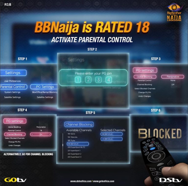 The BBNaija show is rated 18 to protect younger viewers. And if you’re worried about your children or any younger person in your care accidentally stumbling on the channel while you may not be looking, below is a set-by-step guide on setting up the parental control or channel blocking features on your DStv and GOtv decoders.