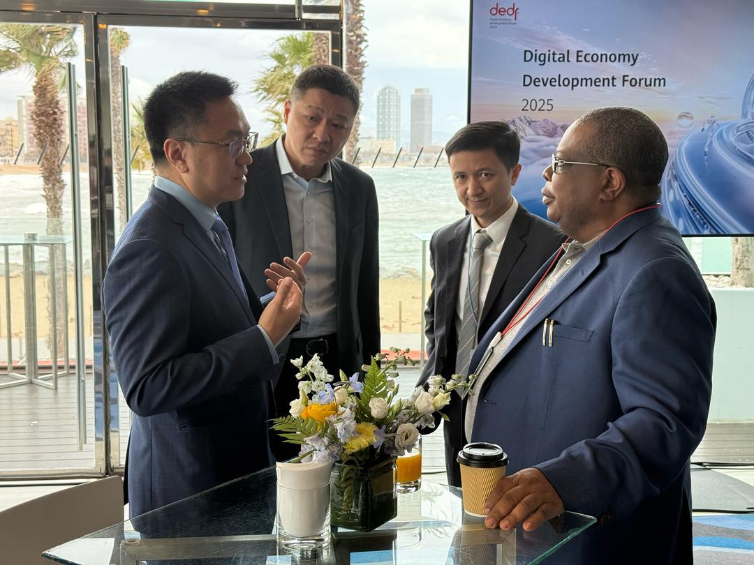 L-R: Tony Bao-Vice President, Huawei, with Stephen Zou, Deputy Managing Director, Huawei Nigeria, Business Affairs; Eric Chen, Strategic Director, Huawei Nigeria; and Joseph Tegbe; Director-General, Nigeria-China Strategic Partnership; during the 2025 Mobile World Congress in Barcelona, Spain.