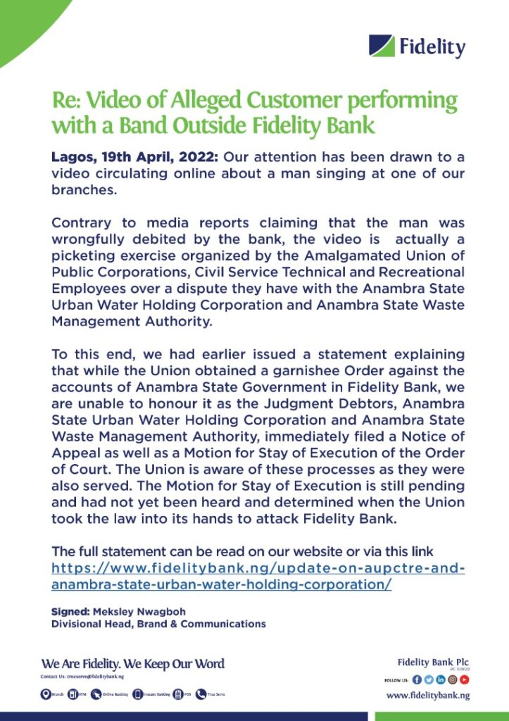 In a statement made available today, April 19, 2022 and titled “Re: Video of Alleged Customer performing with a Band Outside Fidelity Bank” the leading financial institution convincingly put things in proper perspectives.