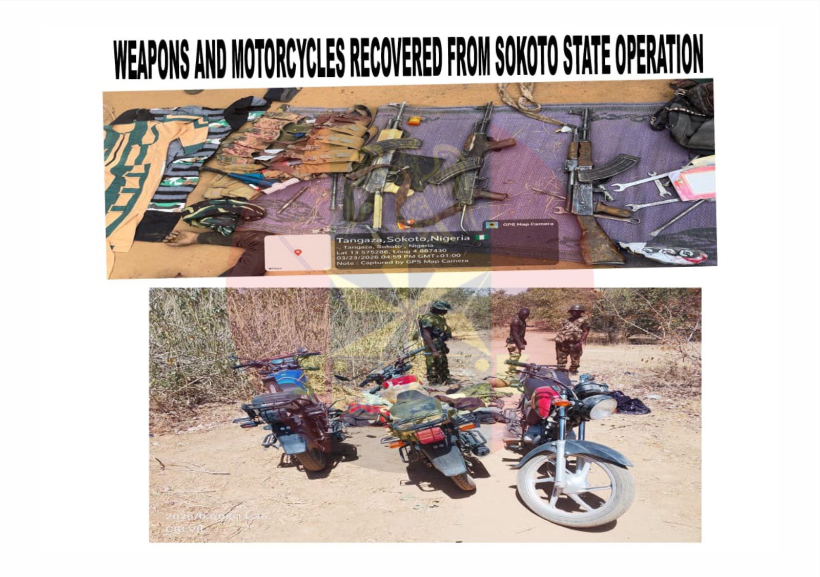 In Sokoto State, on 25 March 2026,troops of COAS Intervention Battalion VII made 2 seperate contacts with terrorists at Magonho Forest where they eliminated 3 bandits and recovered 3 AK 47 rifles and motorcycles.