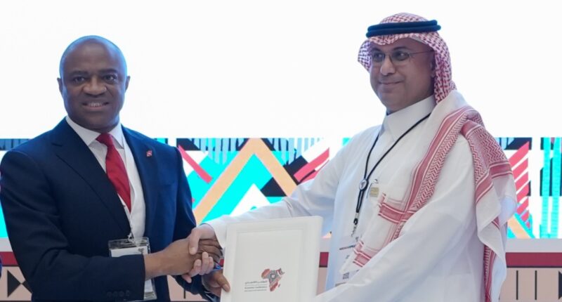 Group Managing Director/CEO, United Bank for Africa (UBA), Oliver Alawuba and CEO, Saudi Export-Import Bank (SAUDI EXIM), Engr. Saad Akhaib, during the signing of Memorandum of Understanding between UBA and Saudi EXIM towards enhancing business relations and export growth between Saudi Arabia and Africa, at the Saudi-Arab-African Economic Conference, in Riyadh, Saudi Arabia, on Thursday