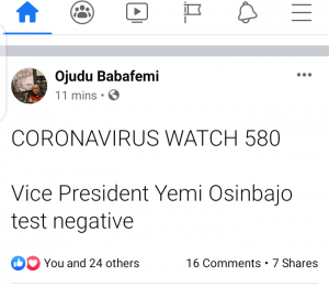 Mr Ojudu simply wrote… “Vice President Yemi Osinbajo tests negative ”