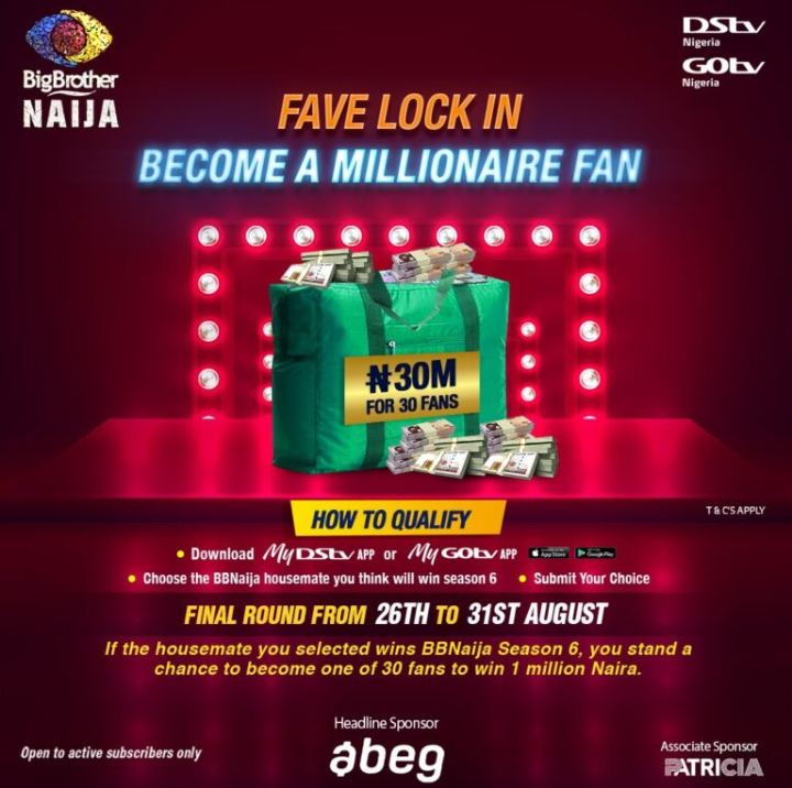 The headline sponsor of BBNaija Season 6 is Abeg, and the associate sponsor is Patricia. Visit www.dstvafrica.com or www.gotvafrica.com to find out more.