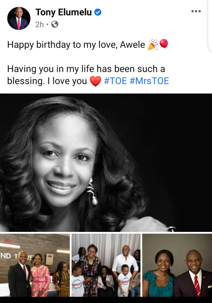 “Happy birthday to my love, Awele 🎉 Having you in my life has been such a blessing. I love you ❤️ #TOE #MrsTOE,” Mr Elumelu wrote on his Facebook page celebrating the woman he walked down the aisle some twenty-seven years ago.