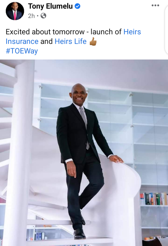 Mr Elumelu announced his state of mind ahead of tomorrow’s much anticipated event in a social media post which reads… “Excited about tomorrow – launch of Heirs Insurance and Heirs Life 👍🏾 #TOEWay”.